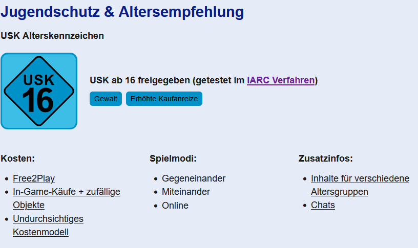 Die deutsche USK hat Roblox vor kurzem „Ab 16 Jahre“ eingestuft. Dies gegenüber PEGI welche das Spiel ursprünglich ab 7 Jahre und nun ohne Alter als „Parental Guidance Recommended“ (Elterliche Begleitung empfohlen) einstuft. Dies primär, weil die Plattform nutzer*innengenerierte Inhalte anbietet. Theoretisch müssten Eltern einer Erstellung des Kontos zustimmen. Faktisch kann man jedoch ohne Probleme ein Konto ohne Emailadresse mit Altersangabe unter 12 Jahren erstellen.